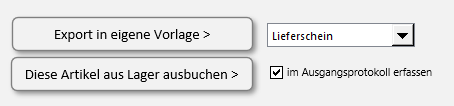 Klicken Sie auf „Export in eigene Vorlage“ um Ihre Artikel beispielsweise in ein Lieferscheinformular zu übertragen. Details dazu finden Sie hier.