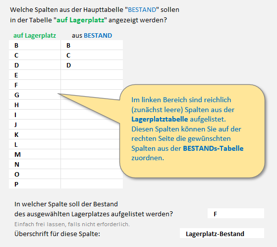 Unten rechts geben Sie an, in welcher Spalte (zB. F) der Lagerplatz-Bestand angezeigt werden soll und wie Sie die Spalte benennen wollen.