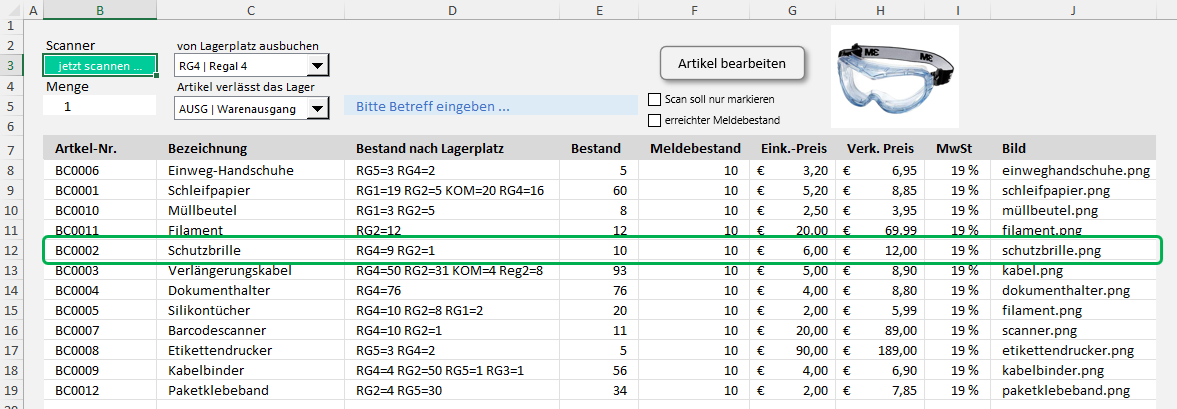Beispiel: Den Artikel Schutzbrille gibt es 9x im Regal 4 und 1x im Regal 2. Der Eintrag in dieser Spalte lautet entsprechend: RG4=9 RG2=1.
