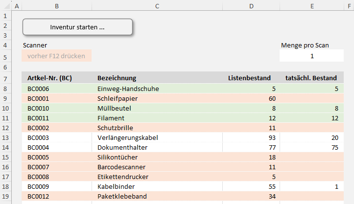 Alle Artikel werden zunächst rot hinterlegt, da noch kein tatsächlicher Bestand erfasst wurde.
