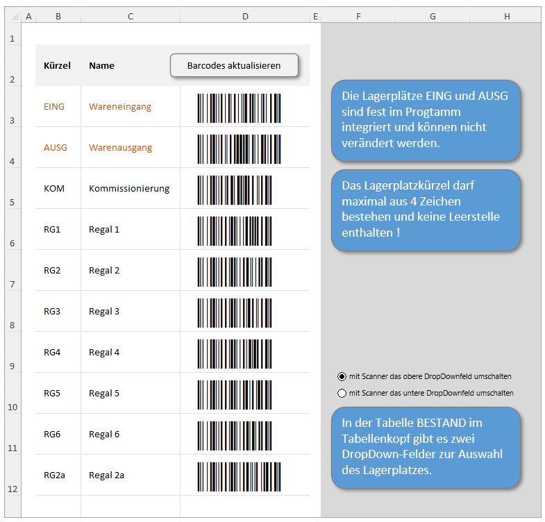 Mit den Funktionsbarcodes können Sie den Lagerplatz bequem per Scan umschalten.