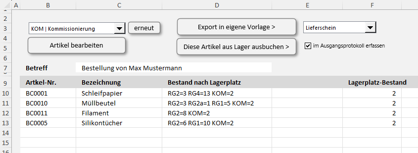 In der Tabelle „auf Lagerplatz“ können Sie alle Artikel in eine externe Vorlage exportieren.